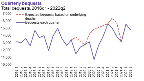Our data show that bequest numbers were around 1.3% lower over the three months to June 2022 compared to the same period last year. However, this was broadly in line with what we would have expected, given the number of deaths and volume of grants of probate issued over the period.